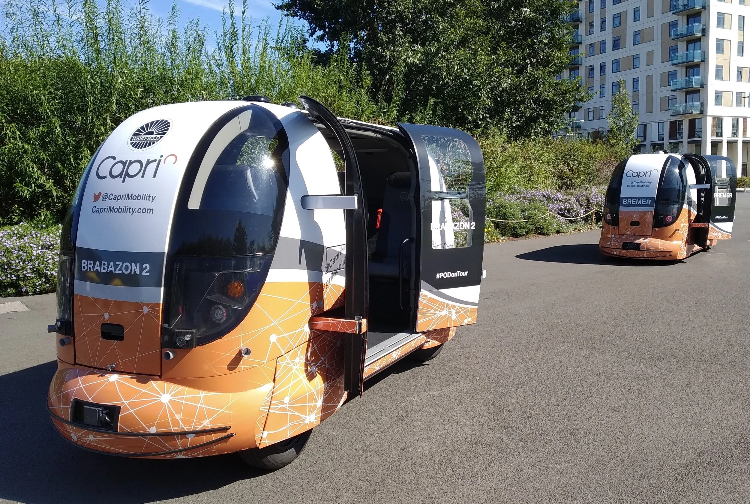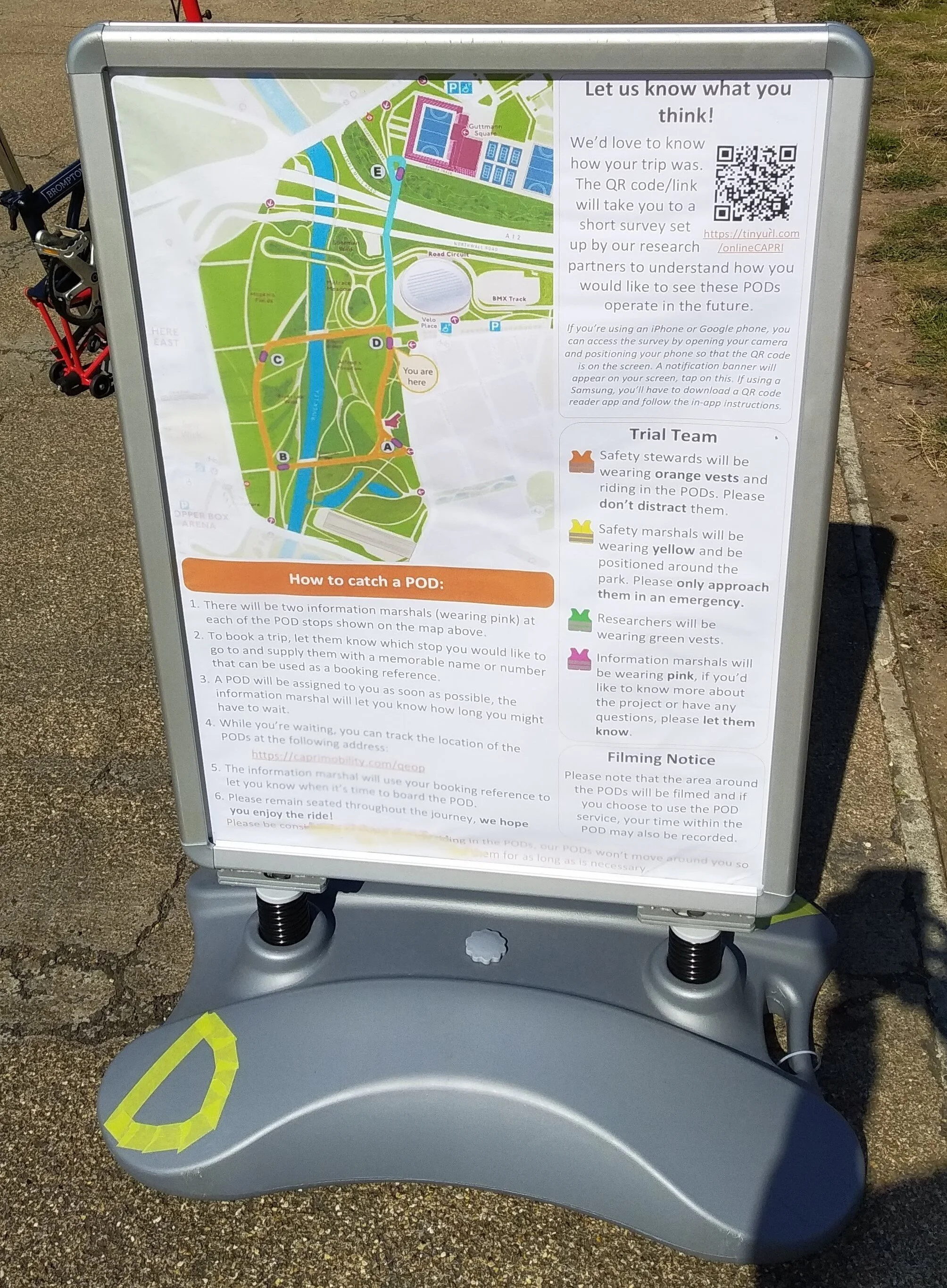 On a warm and sunny Friday in September, I made the trip to the Queen Elizabeth Olympic Park site in Stratford, London to see the self-driving shuttles being trialled there as part of the Capri project. Capri is led by engineering consultancy, AECOM, in a consortium of 19 partners funded by UK Government and industry. I took my Brompton on the train to Waterloo and enjoyed a very pleasant ride along Cycle Superhighway 2 and the River Lea to the location. These trials were of particular interest to me, having led the GATEway project that successfully trialled similar vehicles in Greenwich between 2015 and 2018 – with vehicle manufacturer Westfield the common participant between the two projects.