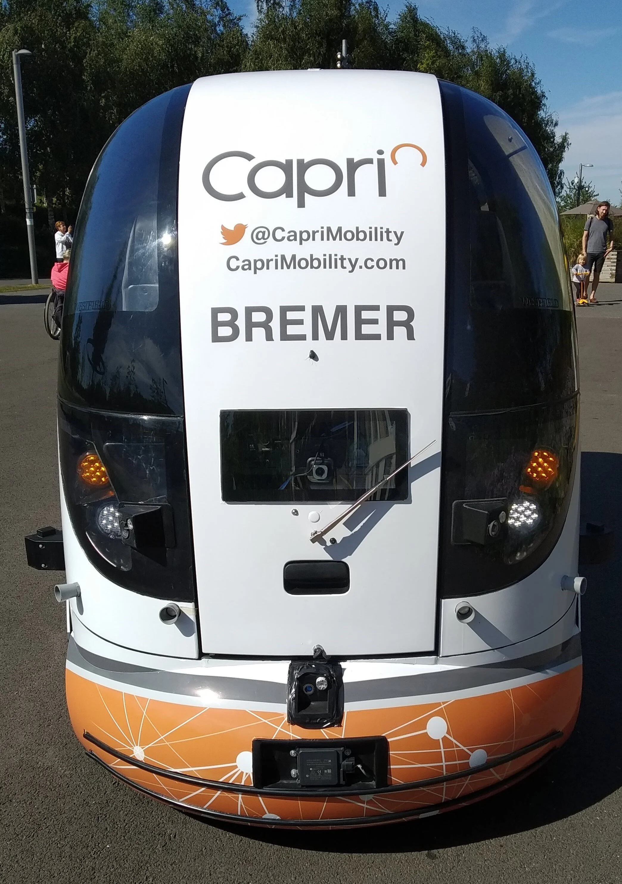 Front of Capri shuttle Bremer – note the multiple camera / lidar pods, low mounted exposed radar and shielded ultrasound sensors
