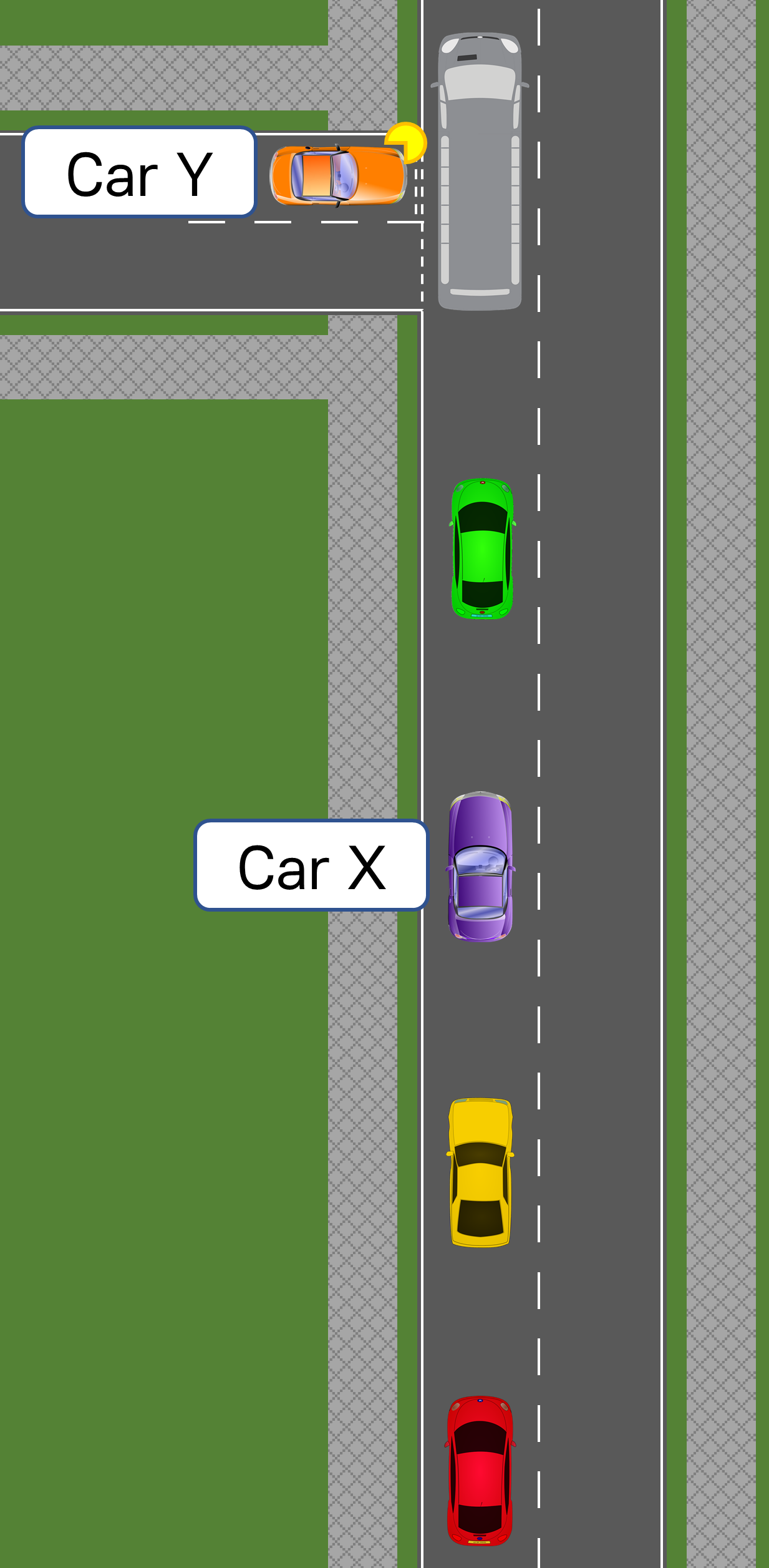 Car Y seeking to pull out of a side road into traffic. The driver of Car X may choose to allow Car Y to pull out.