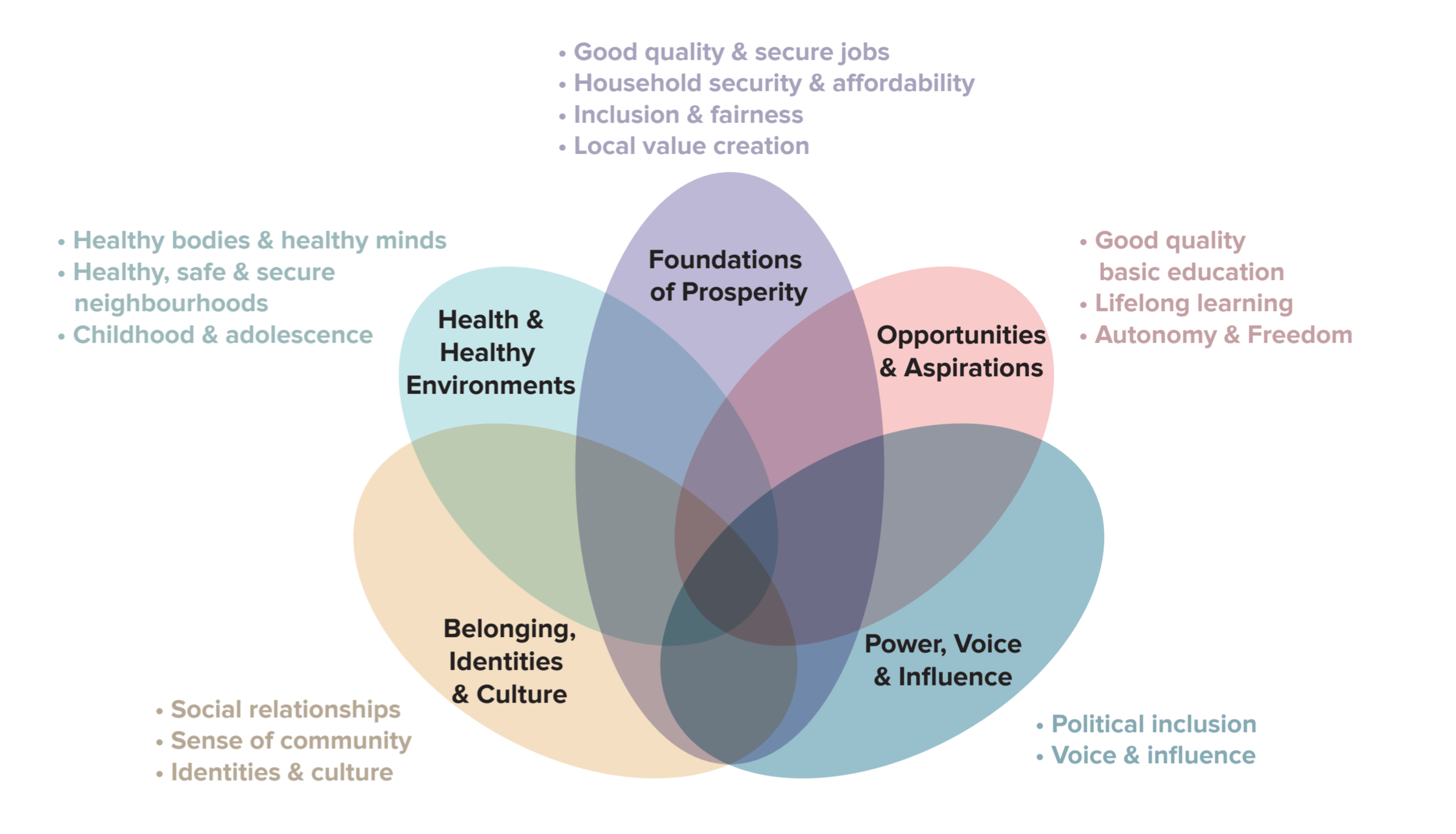 The work of the UCL Institute for Global Prosperity provides some context to help address this question. Moore and Woodcraft (2019)[1] studied London neighbourhoods and examined how prosperity emerges from lived experiences, framing it in a model with five, high-level dimensions – as shown in the figure.